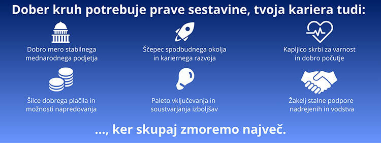 Iščeš razgibano delo v prijetnem kolektivu? Nove izzive z nalogami, ki jih boš z veseljem opravljal/a?Z urejenim delovnim okoljem in zavedanjem, da naš uspeh temelji na naših zaposlenih, njihovi strokovnosti in dobremu opravljenemu delu, verjamemo, da smo skupaj lahko še uspešnejši.